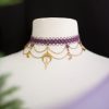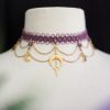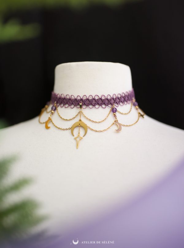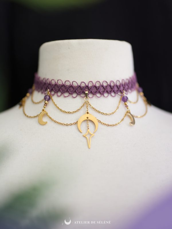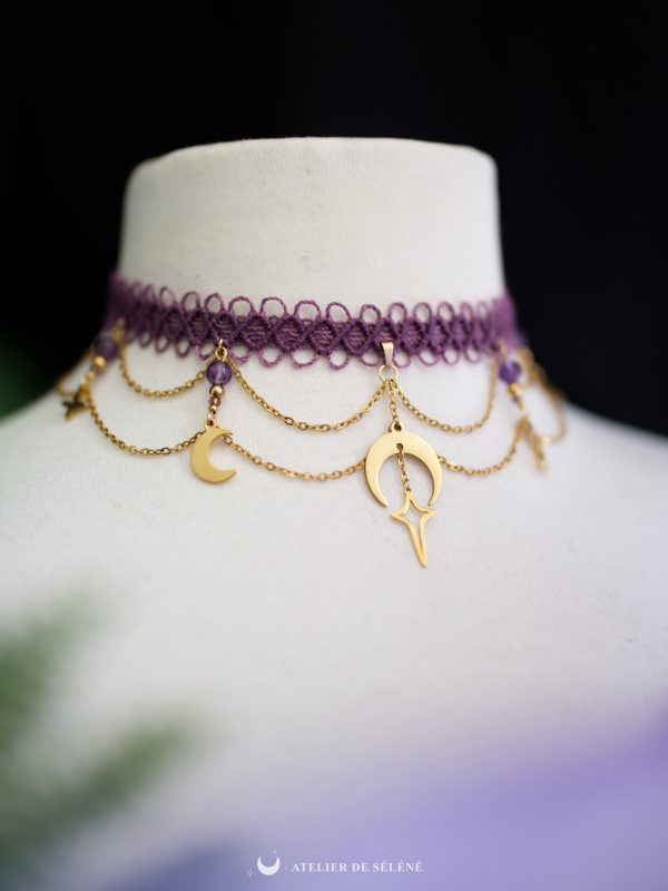 Collier ras de cou violet avec des pendentifs lunes dorés et des chainettes en double rang. J’ai ajouté des perles d’améthyste pour ajouter une touche encore plus élégante à ce bijou