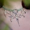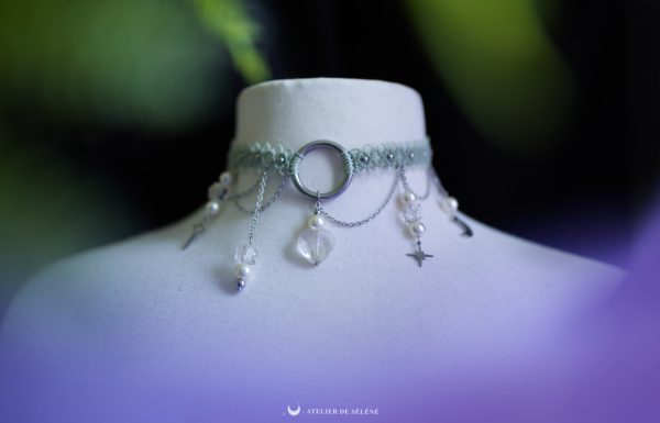 Choker asymétrique argenté avec des perles vintage que j’ai pu obtenir grâce à ma mamie. Je les ai trouvé parfaite pour un choker élégant et à la fois rempli de beaux détails un peu kitch comme les grosses perles à facette transparentes. Kitch mais avec tellement d’harmonie sur ce choker que j’ai presque envie de le garder.
